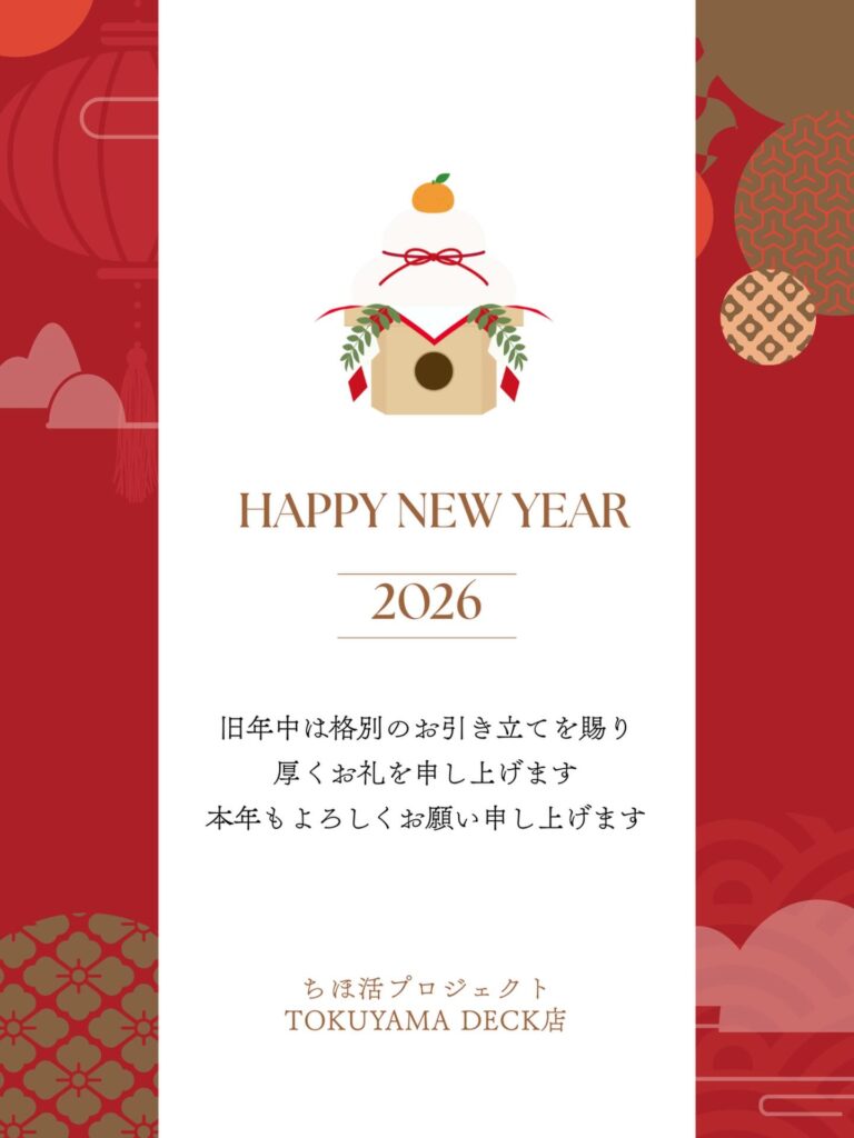 明けましておめでとうございます昨年は「ちほ活」オープンにあたり、多くの方にお世話になりました。オープンしてからは、たくさんのお客様に足を運んでいただきまして、スタッフ一同、感謝の連続でした。本当にありがとうございます!2026年も、皆様の日常に彩りを添えられるような「お気に入り」を見つけるお手伝いをさせていただきます年始の営業開始日は1/5(月)になります。ぜひ新年のお買い物に、遊びにいらしてくださいね。皆様にとって、笑顔あふれる一年になりますように️本年も何卒、よろしくお願いいたいします🏻♂️#ちほ活プロジェクト TOKUYAMA DECK店 #ちほ活プロジェクト #ちほ活 #徳山デッキ #周南市 #徳山 #山口県 #2025オープン #年末のご挨拶 #感謝