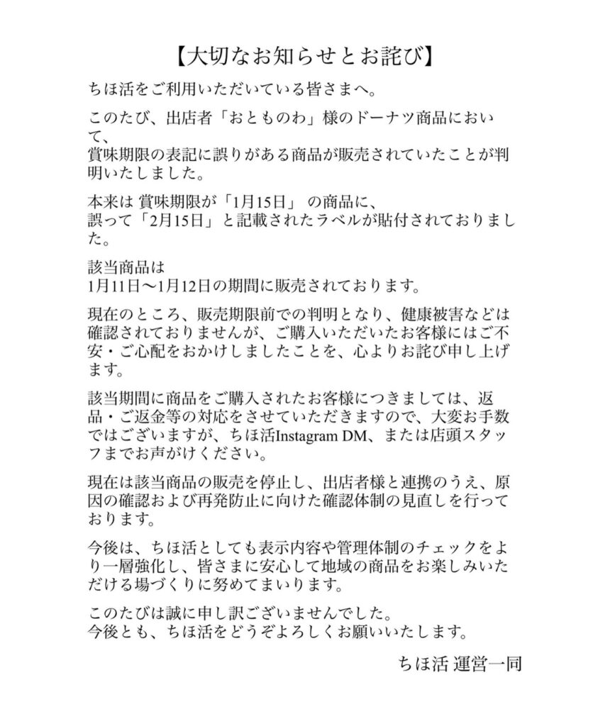 「大切なお知らせとお詫び」上記にあるように、賞味期限の表記に誤りがある食品が販売をされていたことが判明いたしました。現在は該当の商品の販売を停止し、出店者様と連携のうえ、原因の確認・および再発防止に向けた確認体制の見直しを行っております。この度は誠に申し訳ございませんでした。今後とも、ちほ活をどうぞよろしくお願いいたします。